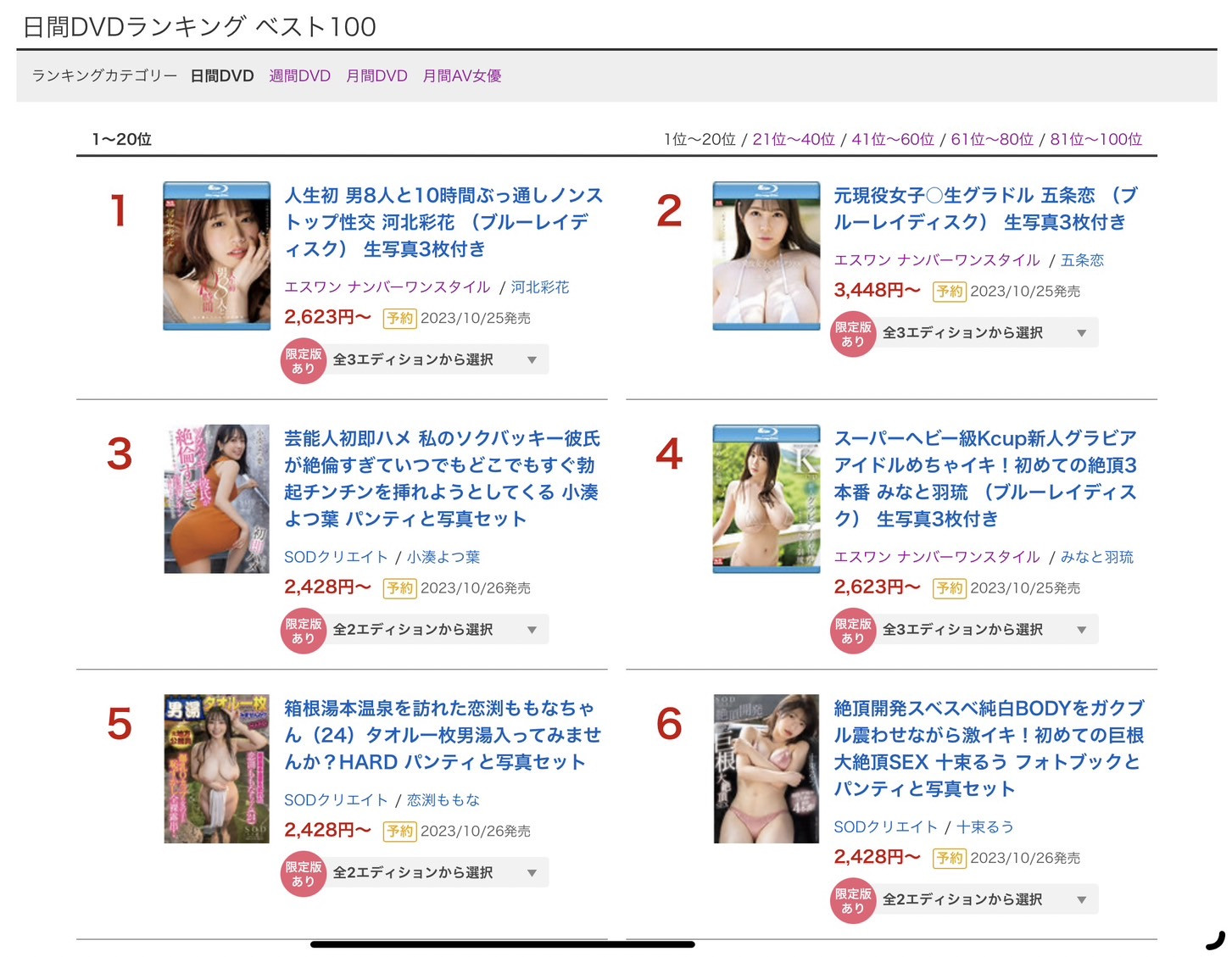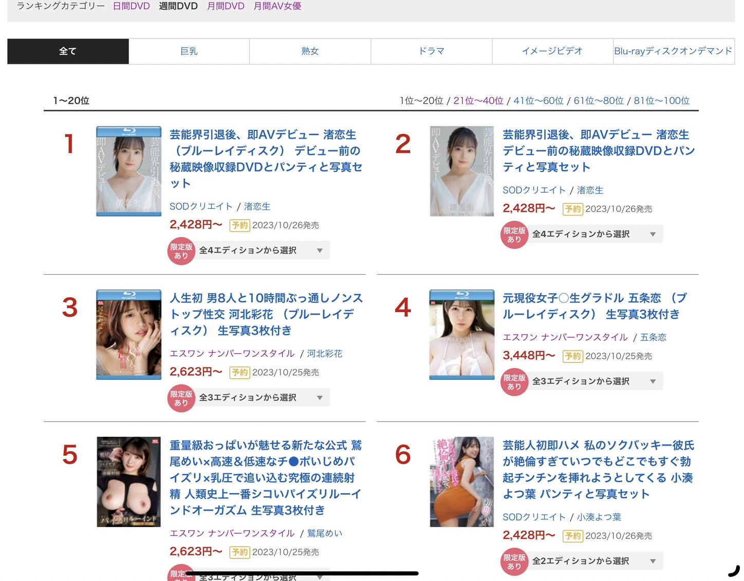 这是本周的销售排行榜(通贩部门)。没错,SODStar花大钱签来的艺能人「渚恋生(渚恋生)」拿下了冠军ー这是必然的,渚恋生卖的不只是她的外型她20年的芭蕾舞资历