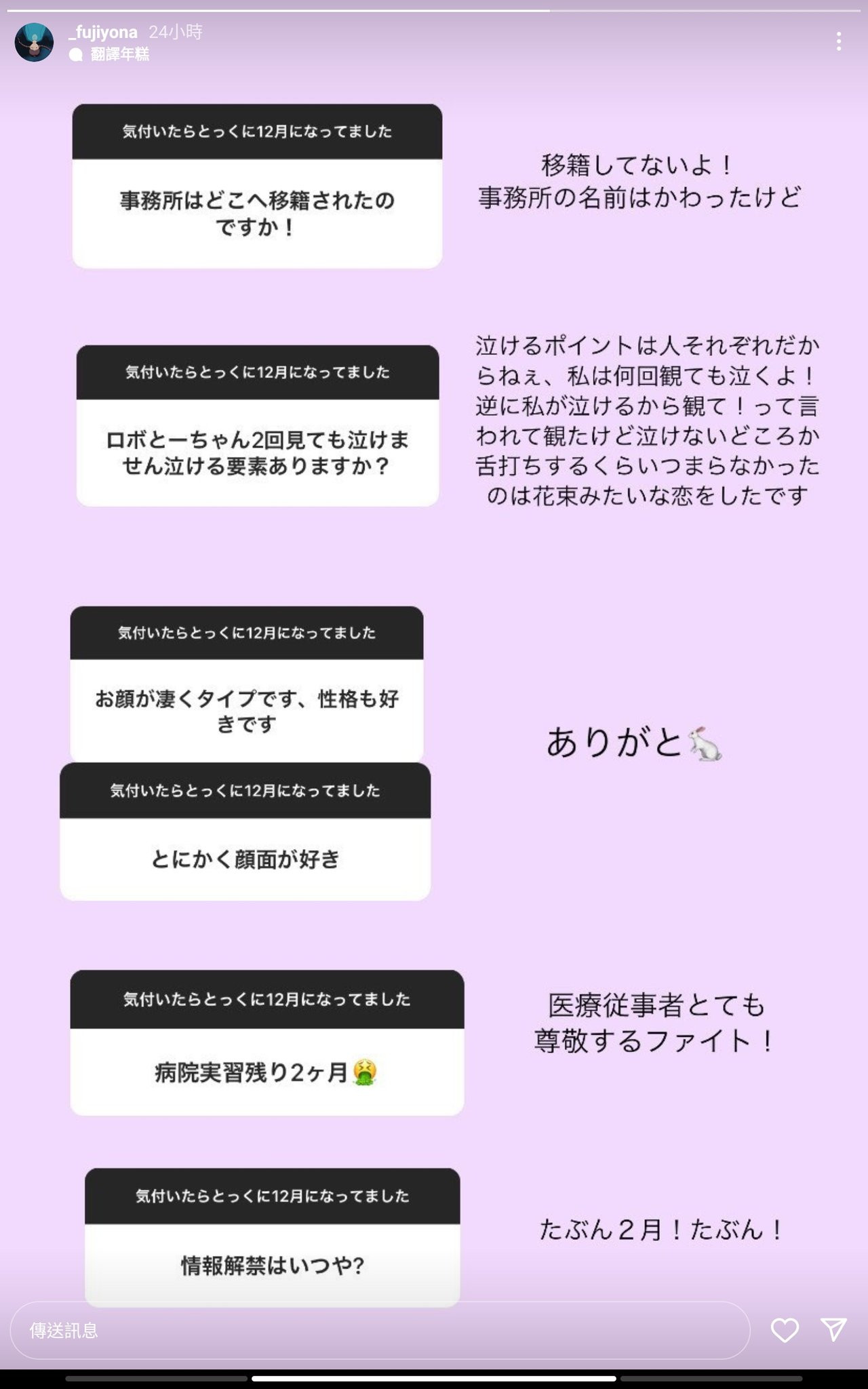 这两天她有在IG限动回覆提问,虽然不是什么都回答但已经够我们了解她在想什么了:首先,她没有跳槽换事务所,还强调现在和以前的事务所虽然是不同名字但其实是同一间;再来,她对摄影会兴趣缺缺,说自己无法胜任那方面的工作;最后,接下来有什么计画吗?藤井いよな(藤井一夜)说了应该会在2月情报解禁: