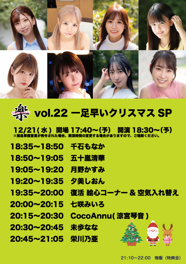比方说「楽演祭vol.22 一足早いクリスマスSP」的活动,未歩なな(未步奈奈)就被安排在倒数第二个出场,坦白说我也不知道这顺序是怎么来的,但以日本粉丝相对比较能接受女优去搞音乐等偶像活动的状况来看,未歩なな(未步奈奈)在这一块比安达夕莉占便宜太多了,也难怪一开始安达夕莉的社群虽然冲得很快一马当先,但现在只能看未歩なな(未步奈奈)的车尾灯了⋯