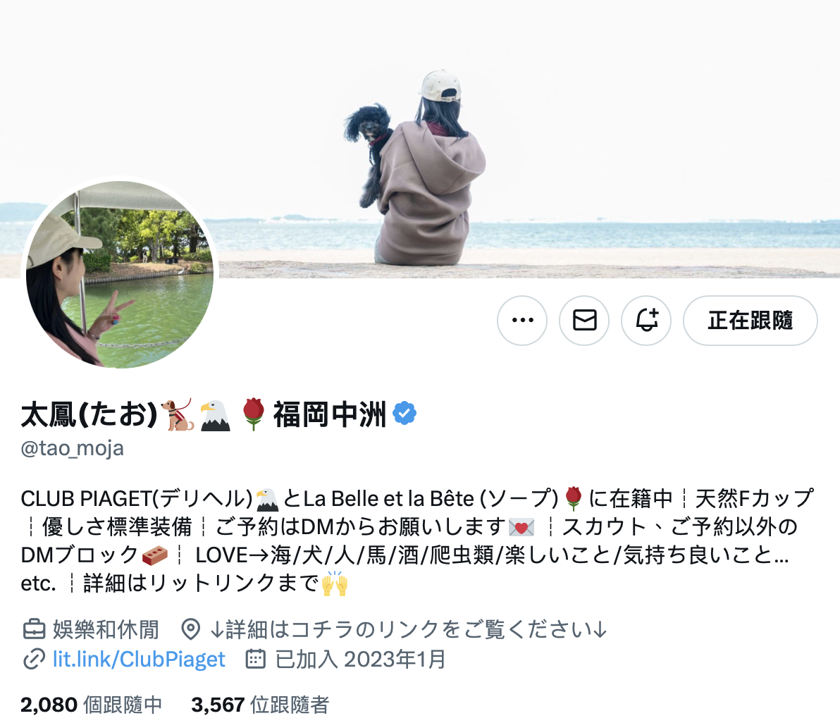 那就是她最近都在自己远藤沙耶的X上转推名为「太凤(たお,https://twitter.com/tao_moja)」,看了影片就知道远藤沙耶这身分只是替身,太凤才是本体,而这位太凤的身分呢,就是个デリヘル(外送茶)以及ソープ(泡泡浴)的风俗妹⋯